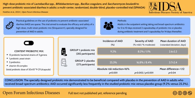 One is about a high-dose, multistrain probiotic mix (Sinquanon®), specially designed for prevention of antibiotic-associated diarrhea in adults: https://academic.oup.com/ofid/article/11/11/ofae615/7828570.